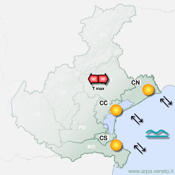 ARPAV Bollettino del 17/04/2026 alle 13:00 Litorale nordven 17 aprile pomeriggio sab 18 aprile mattina sab 18 aprile pomeriggio dom 19 aprile mattina dom 19 aprile pomeriggio lun 20 aprile mar 21 aprile  Cielo: Poco nuvoloso Temp.: max 22/24 C Precipitazioni: Assenti probabilita' : 0% Vento: A regime di brezza  Cielo: Poco nuvoloso Temp.: min 11/13 C Precipitazioni: Assenti probabilita' : 0% Vento: A regime di brezza Attendibilita': Buona  Cielo: Poco nuvoloso Temp.: max 22/24 C Precipitazioni: Assenti probabilita' : 0% Vento: A regime di brezza Attendibilita': Buona  Cielo: Sereno o poco nuvoloso Temp.: min 9/11 C Precipitazioni: Assenti probabilita' : 0% Vento: A regime di brezza Attendibilita': Buona  Cielo: Nuvolosità in aumento Temp.: max 21/23 C Precipitazioni: Rovesci o temporali locali probabilita' : 40% Vento: Deboli da sudest Attendibilita': Buona  Cielo: Annuvolamenti e schiarite Precipitazioni: Sparse anche a carattere di rovescio probabilita' : 50% Attendibilita': Buona  Cielo: Annuvolamenti e schiarite Precipitazioni: Sparse anche a carattere di rovescio/temporale probabilita' : 50% Attendibilita': Discreta Evoluzione generale Fino a sabato la presenza dell'anticiclone delle Azzorre garantirà tempo in prevalenza stabile e soleggiato. Domenica la pressione cederà, per l'avvicinamento di una saccatura da nord che farà il suo ingresso lunedì. Il tempo sulla regione fino a martedì diverrà quindi instabile, a partire dalle zone montane e in seguito anche sulla pianura, con fasi di precipitazioni, anche a carattere di rovescio e temporale. Le temperature massime saranno ben superiori alla media fino a domenica, per poi calare da lunedì, riportandosi nella media o lievemente inferiori in montagna. | 17 aprile