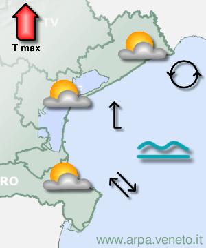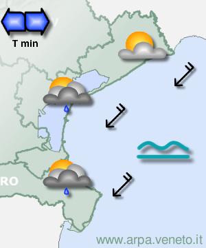 Tempo atteso: Tempo variabile, con addensamenti nuvolosi alternati a spazi di sereno. Precipitazioni: Possibili locali piogge specie di pomeriggio, più che altro sulle zone pedemontane. Temperature: Minime in contenuto calo, massime in contenuto aumento. Venti: Generalmente deboli con direzione variabile. Mare: Da poco mosso a quasi calmo. Attendibilità: Buona