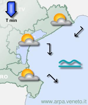 ARPAV Bollettino del 14/04/2026 alle 13:00 aggiornamento del 15/04 alle 09.00 Litorale nordmer 15 aprile mattina mer 15 aprile pomeriggio gio 16 aprile mattina gio 16 aprile pomeriggio ven 17 aprile sab 18 aprile  Cielo: Nuvolosità in diminuzione Temp.: min 11/13 C Precipitazioni: Modeste piogge locali probabilita' : 50% Vento: Moderati da nordest Attendibilita': Buona  Cielo: Annuvolamenti e schiarite Temp.: max 22/24 C Precipitazioni: Generalmente assenti probabilita' : 0% Vento: Variabili Attendibilita': Buona  Cielo: Annuvolamenti e schiarite Temp.: min 9/11 C Precipitazioni: Assenti probabilita' : 0% Vento: Deboli da nordest Attendibilita': Buona  Cielo: Annuvolamenti e schiarite Temp.: max 23/25 C Precipitazioni: Assenti probabilita' : 0% Vento: Variabili Attendibilita': Buona  Cielo: Annuvolamenti e schiarite Precipitazioni: Assenti probabilita' : 0% Attendibilita': Buona  Cielo: Annuvolamenti e schiarite Precipitazioni: Generalmente assenti probabilita' : 0% Attendibilita': Discreta Evoluzione generale A inizio periodo si esaurisce gradualmente una moderata depressione centrata tra l'Italia e il Nord Africa, che sulla nostra regione ha portato correnti umide con molte nubi e delle precipitazioni; in seguito la circolazione si fa leggermente anticiclonica e permette una variabilità con maggiori spazi di sereno, nubi meno insistenti e precipitazioni più rade, oltre ad una significativa ripresa dell'escursione termica diurna. | 14 aprile